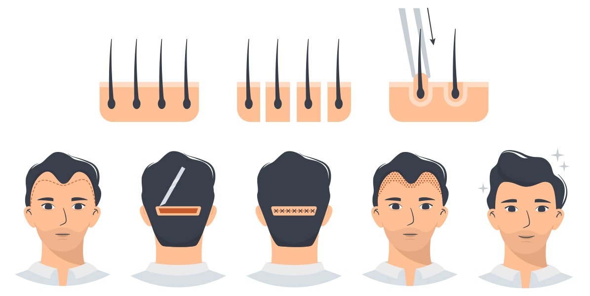 Před zákrokem se zkrátí vlasy v oblasti, odkud se budou odebírat vlasové štěpy, tedy v oblasti týlu. V některých případech se zkracují vlasy i v místě, kam se štěpy budou transplantovat. Místo odběru se znecitliví anestetickým roztokem. Nejprve dochází k odběru určité vlasové oblasti, max. v šíři 1,5 cm. Pro určení velikosti odebírané plochy se používá jednoduchý propočet, kdy se z 1 cm2 odebírané plochy zdravých vlasů udělá zhruba 100 folikulárních jednotek.